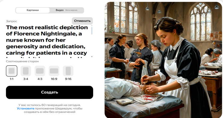 Буквально на днях с одной из групп студентов мы изучали тему «Флоренс Найтингейл. Биография. Роль в медицине» и вот какие изображения сгенерировали студенты в качестве обобщения изученного материала.