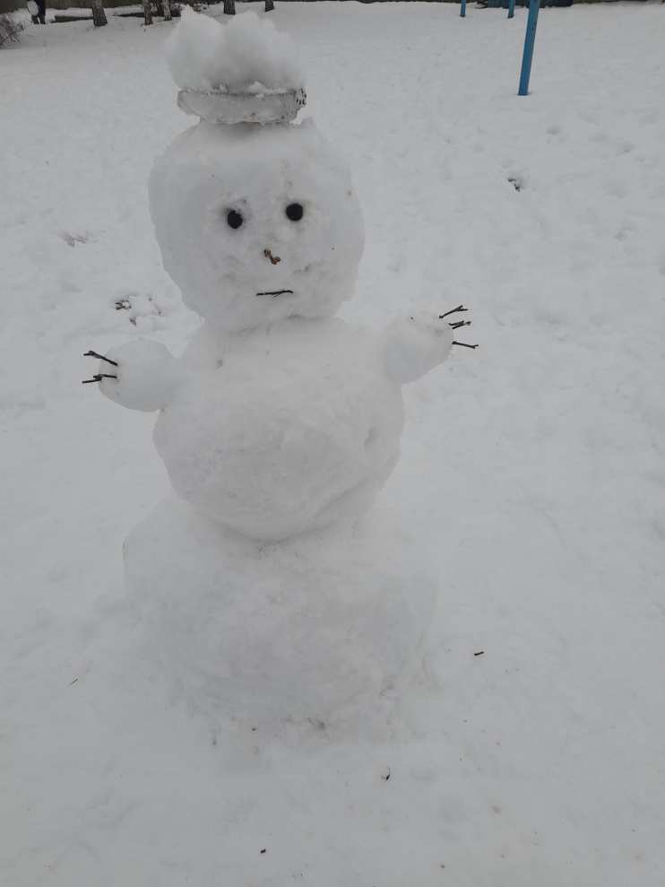 А когда выпал, хоть и небольшой снег, дети с большим удовольствием взялись лепить снеговика. Правда, строительный материал был, что попалось под руку. А получился он вот такой.