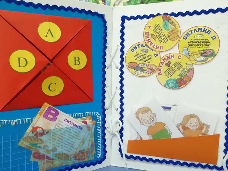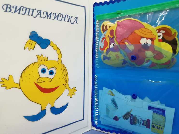 Лэпбук «Путешествие Витаминки» - это самодельная интерактивная папка на картонной основе. В ней собран материал о витаминах и продуктах, их содержащих в виде разной конфигурации карманов.