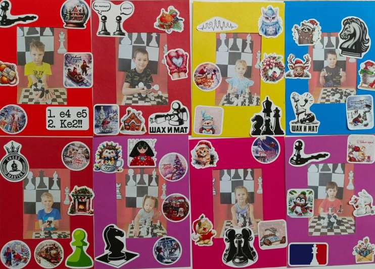 Каждая открытка - это не просто поздравление, а воплощение творческого подхода к шахматам. Участники используют множество новогодних картинок, что делает каждое изделие особенным. В этом процессе все чувствуют радость и вдохновение, вкладывая свою душу в каждую деталь.