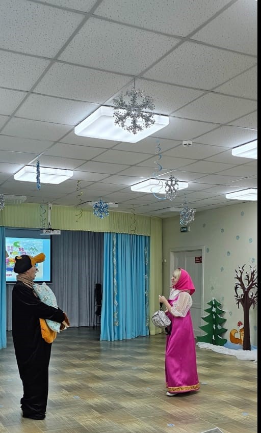 Дети пришли на праздник веселые и нарядные в предвкушении чудес. И началось волшебство. В зал под музыку прибежала веселая Маша, которая будила сонного медведя и звала его поиграть с ребятами. Дети с большим удовольствием играли с Машей и медведем в снежки. Потом медведь плясал и пел вместе с ребятами.