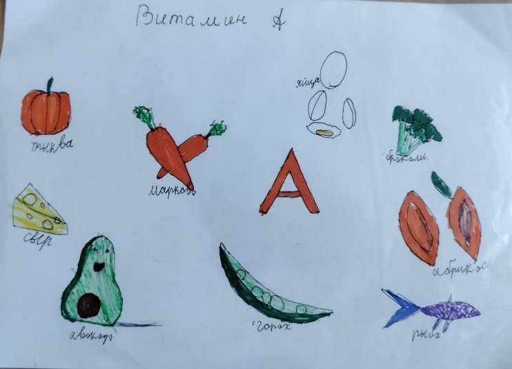 - Витамин A: необходим для здоровья кожи и зрения, а также укрепляет иммунную систему. Содержится в моркови, сладком картофеле и шпинате. Один из мальчиков нарисовал яркую морковь, подчеркивая, насколько важно включать её в свой рацион.
