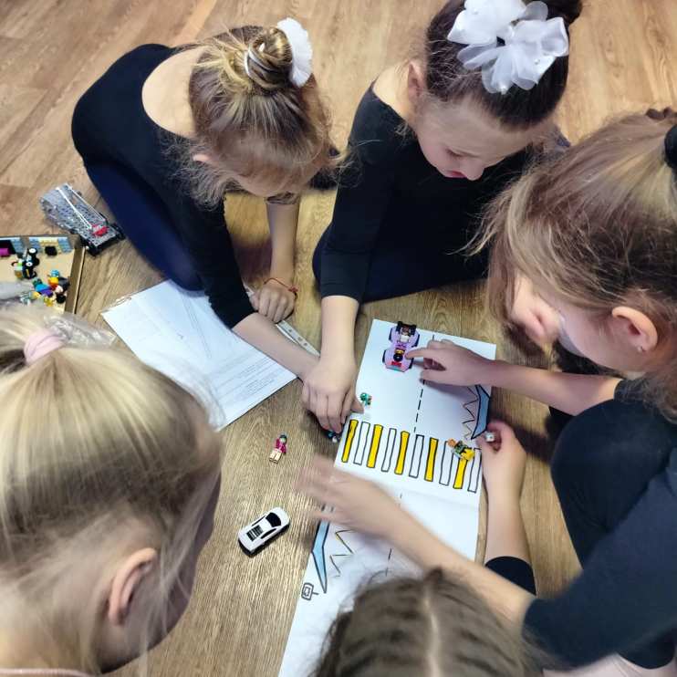 Собравшись в классе, наши маленькие знатоки ПДД разделились на группы. Каждая команда получила игрушечные фигурки человечков и машинок LEGO, а также инструкции по разыгрыванию разных ситуаций на дороге. Учителя подготовили несколько сценариев, охватывающих различные аспекты дорожно-транспортных происшествий: от перехода через пешеходный переход и ожидания зеленого света светофора до взаимодействия пешеходов и водителей в сложных условиях.