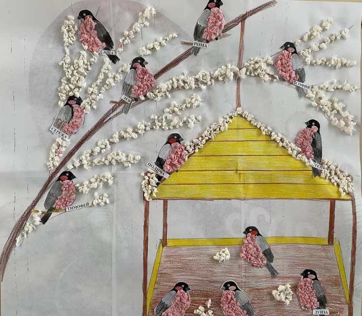 Ребята усвоили, что красногрудые снегири, как и все птицы, нуждаются в заботе и помощи человека не только в свой праздник, но и каждый день. Свои яркие впечатления дети отразили в коллективной работе "Чудо наши снегири!"