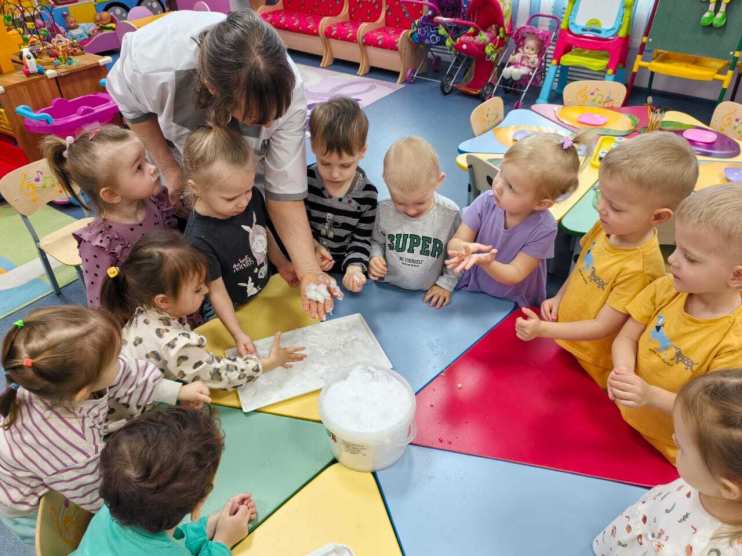 В рамках реализации долгосрочного экологического проекта "Времена года" малыши группы раннего возраста №2 провели небольшой эксперимент со снегом.