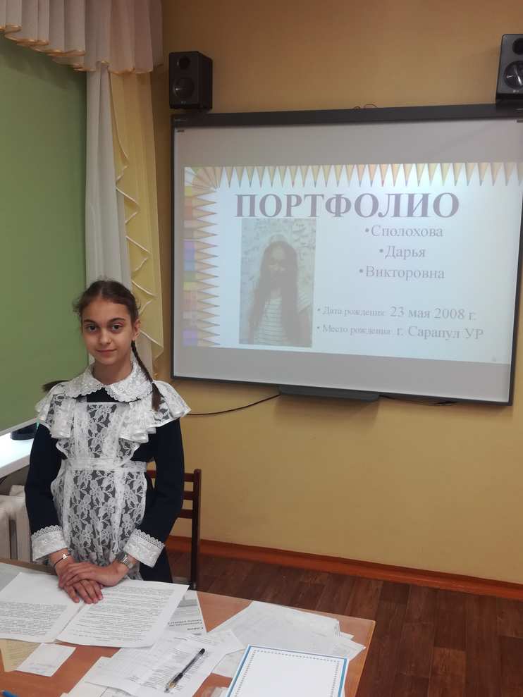 Девятиклассники обязательно презентуют свои портфолио индивидуально по окончании 9 класса в кабинете директора. Остальные ребята тоже представляют портфолио, но только в своих классах на классных часах в мае.