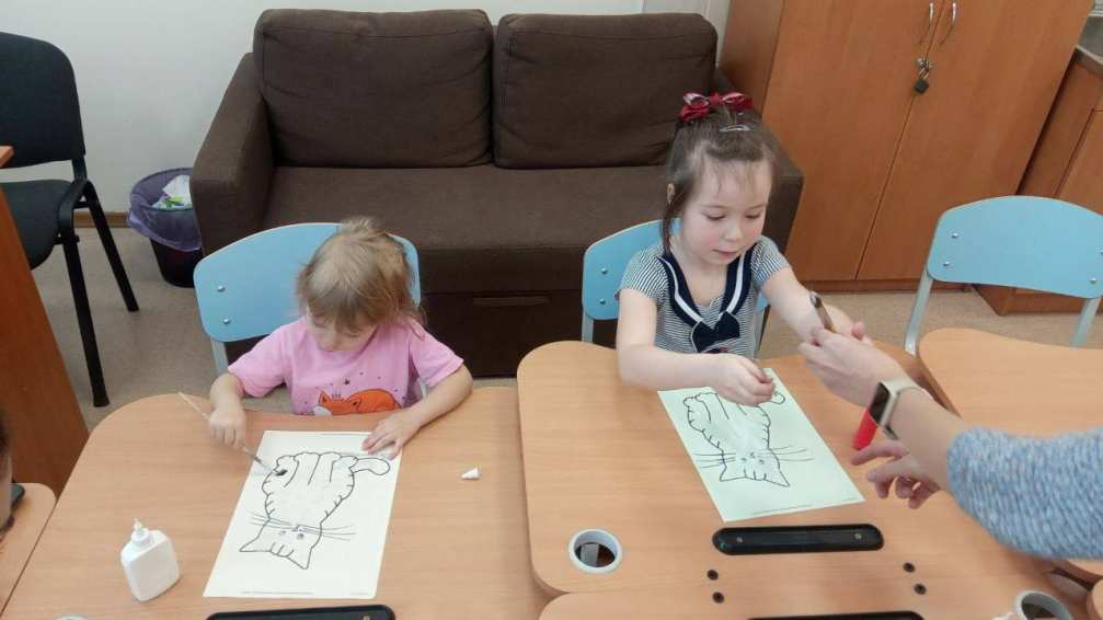 Завершающим этапом стало творческое занятие — создание аппликации "Котик из ваты". Дети приклеивали кусочки ваты, которая имитировала мягкую шерстку животного на основу – силуэт кошки.