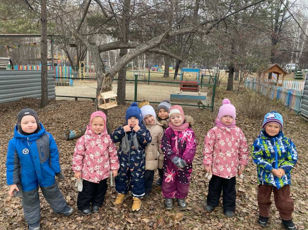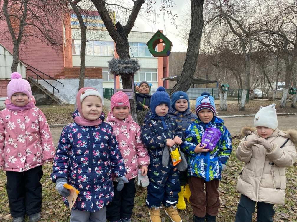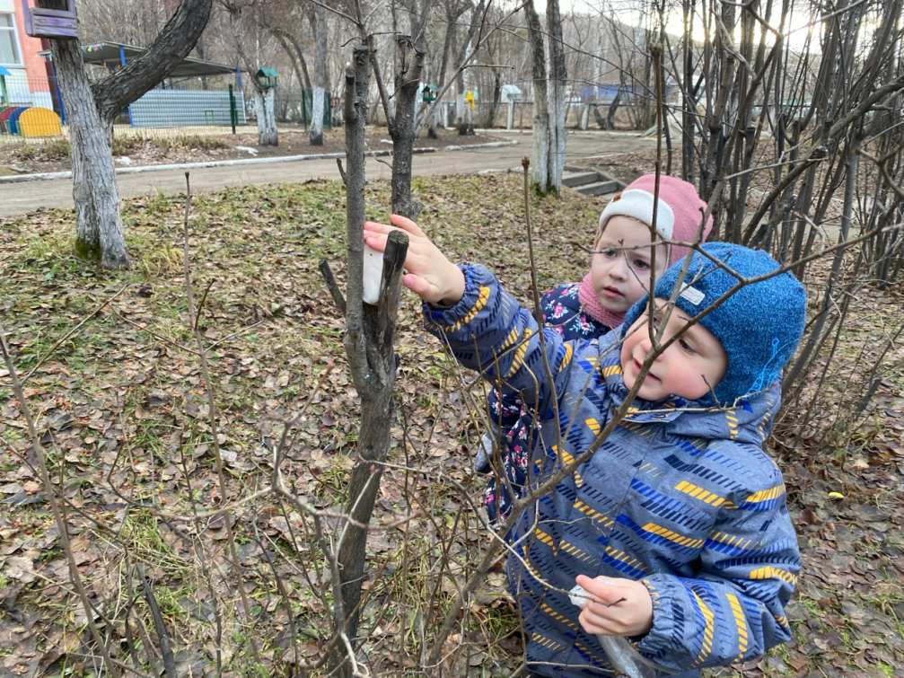 Во время прогулки дети вместе с воспитателями развесили на участке кормушки, сделанные с родителями, и покормили птиц.