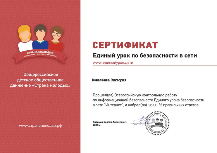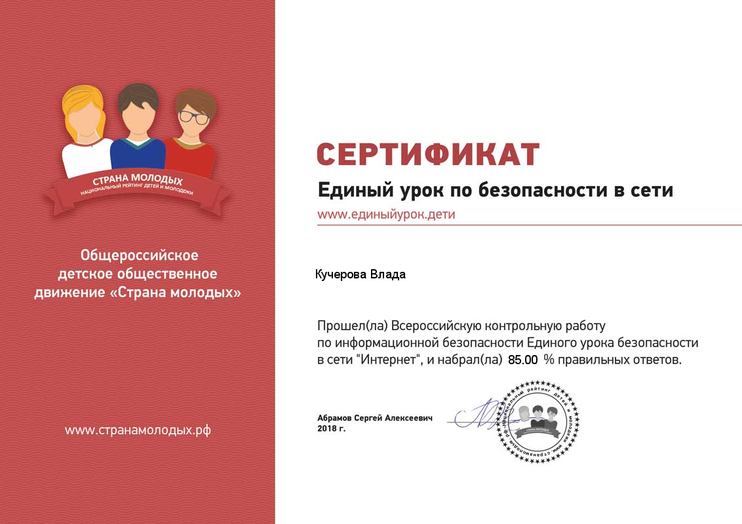 В конце теста учащиеся узнали сразу результаты своего тестирования, а также получили электронный документ об успешном прохождении контрольной работы и об участии в Едином уроке безопасности в сети «Интернет» в 2018 году со своими результатами.