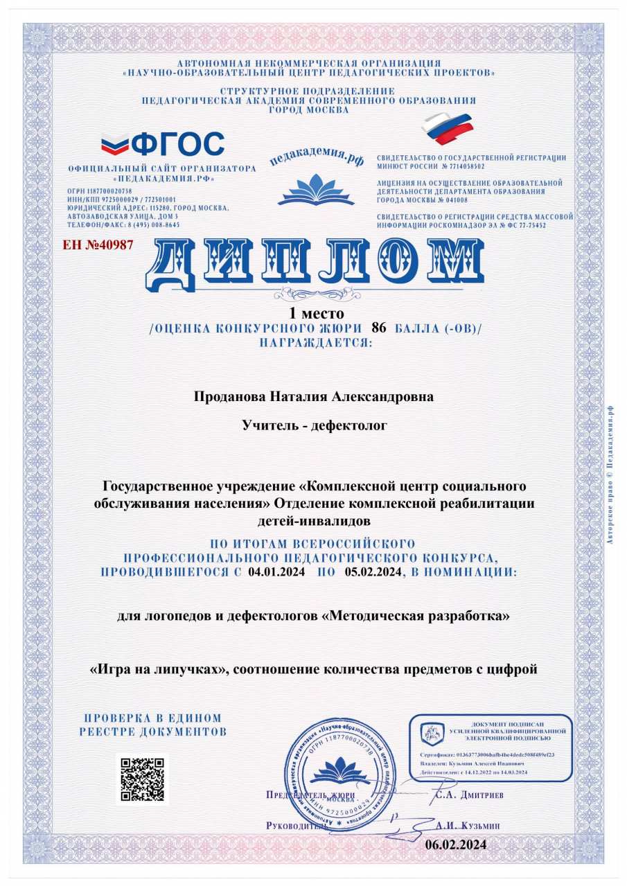 1. Участие в конкурсе «Педагогическая академия современного образования». Всероссийский конкурс для логопедов и дефектологов «Методическая разработка». Диплом 1 место. Название работы: Игра на липучках «Соотношение количества предметов с цифрой». 06.02.2024