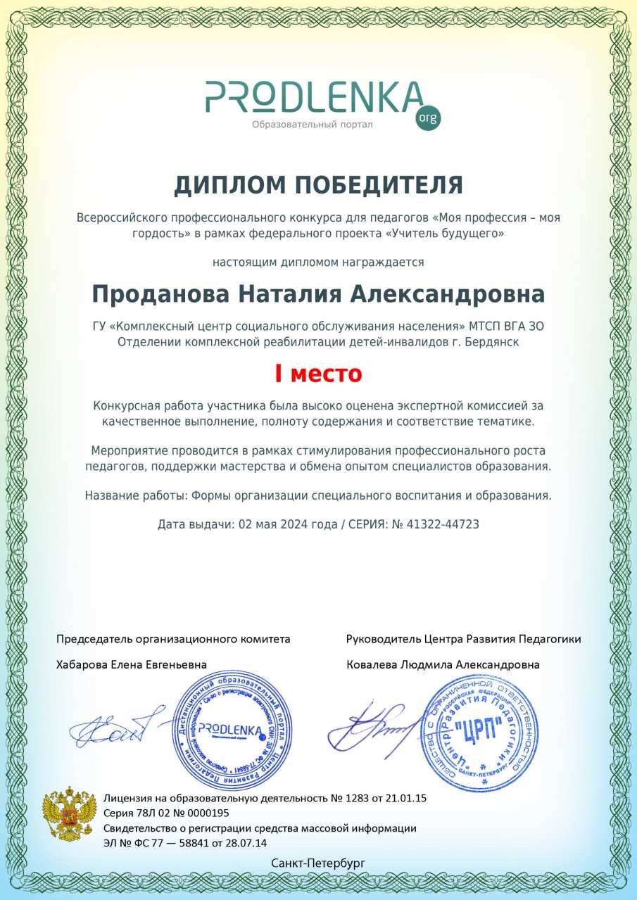 3. Участие в конкурсе «Образовательный портал Prodlenka». Всероссийский профессиональный конкурс для педагогов «Моя профессия — моя гордость» в рамках федерального проекта «Учитель года». Диплом 1 место. Название работы: «Формы организации специального воспитания и образования». 02 мая 2024