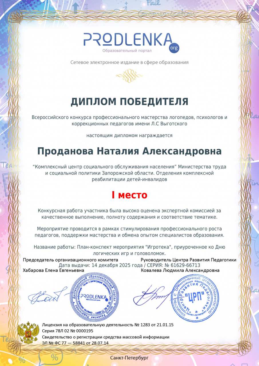 4. Участие в конкурсе «Образовательный портал Prodlenka». Всероссийский конкурс профессионального мастерства логопедов, психологов и коррекционных педагогов имени Л. С. Выготского Диплом 1 место. Название работы: План-конспект мероприятия "Игротека", приуроченое ко дню логических игр и головоломок. 14.12.2025 г.