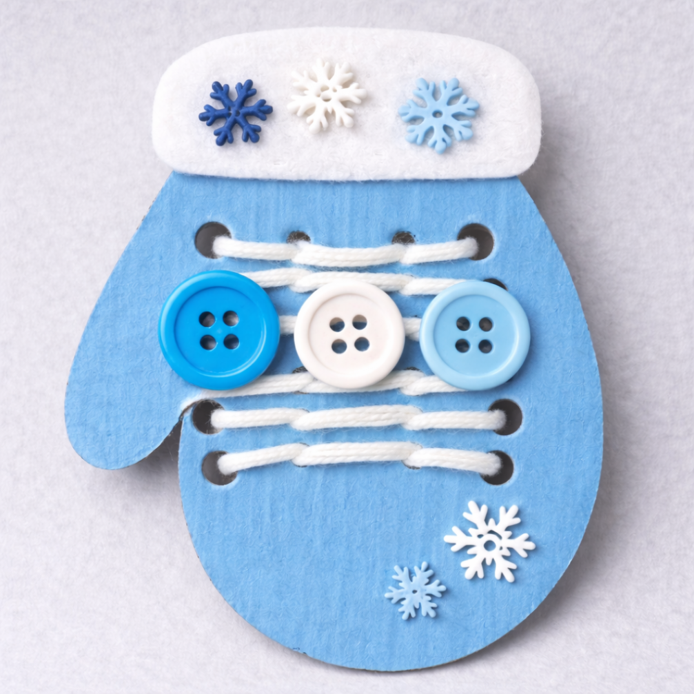 Изделие выполнено в форме варежки из плотной основы (подойдёт окрашенный картон, фоамиран или тонкий фетр). Варежка окрашена в голубой цвет, что сразу задаёт зимнее настроение. Сверху оформлена манжета из белого фетра — она напоминает снег и делает работу аккуратной и нарядной. Для украшения можно добавить снежинки, небольшие декоративные элементы и крупные пуговицы зимних оттенков. Главная особенность пособия — шнуровка: в варежке сделаны крупные отверстия, через которые продевается шнурок или толстая пряжа. Благодаря увеличенным отверстиям ребёнку удобно попадать шнуром, а процесс становится доступным даже при недостаточно развитой моторике.