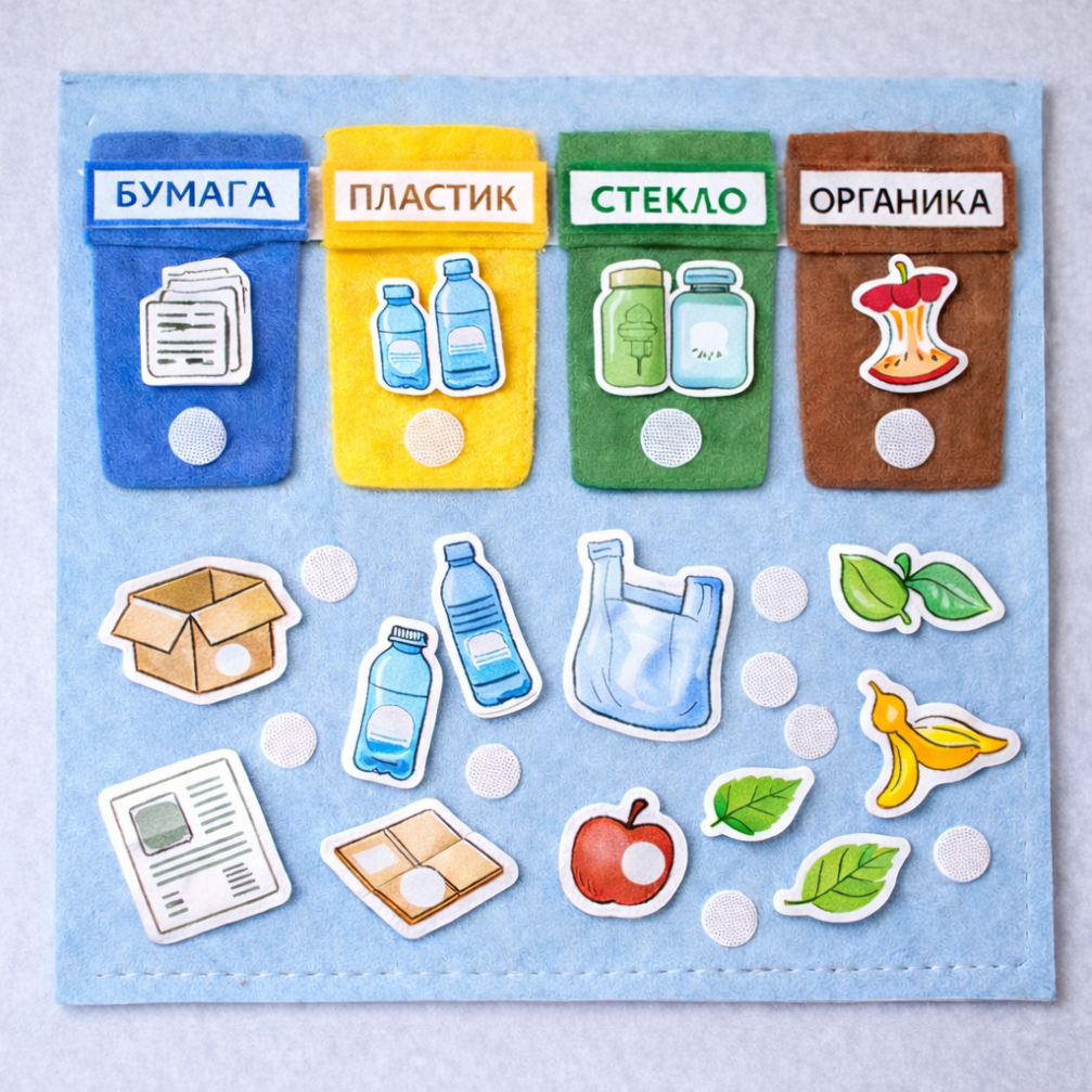 Внизу располагается набор карточек-предметов, вырезанных вручную: коробка и газета (бумага), пластиковые бутылки и пакет (пластик), стеклянные банки (стекло), яблоко, банановая кожура и листочки (органика). На карточках и на планшете видны липучки-кружочки, благодаря которым элементы легко крепятся и снимаются, а игра становится интерактивной и безопасной.