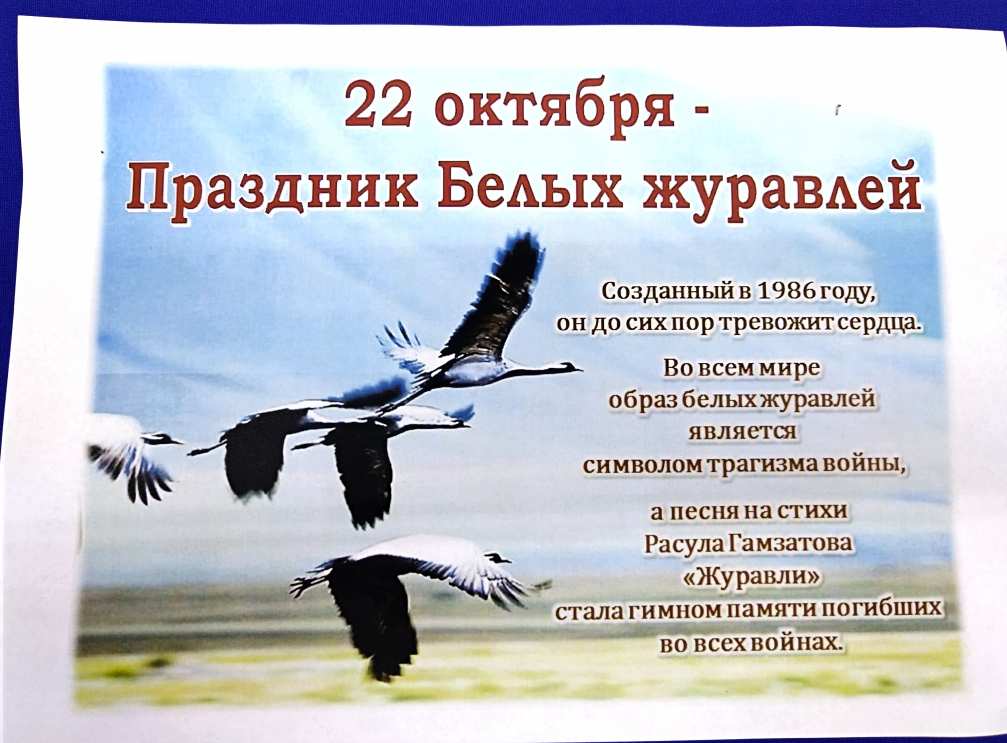 Патриотическая акция, посвящённая Дню белых журавлей, прошла в объединении «Краеведение и туризм». Это один из самых поэтических праздников России, который ежегодно отмечается 22 сентября. Название «Белые журавли» взято из известной песни Расула Гамзатова. Впервые День белых журавлей отметили в 1986 году — это праздник поэзии, дружбы народов и памяти погибшим в различных войнах солдатам.