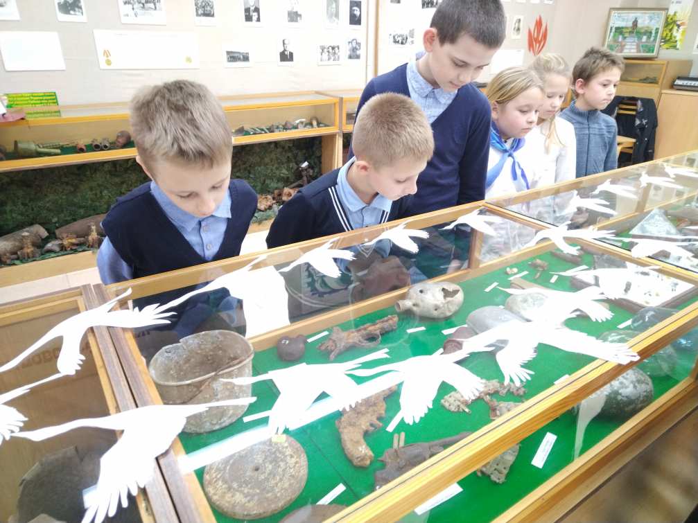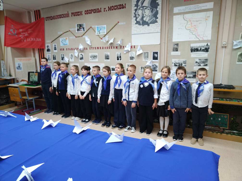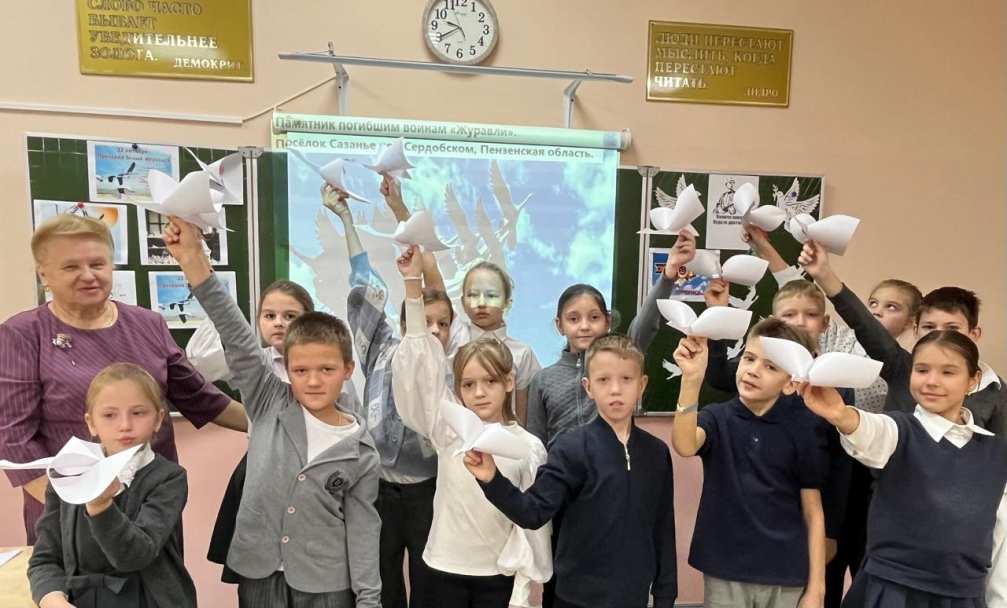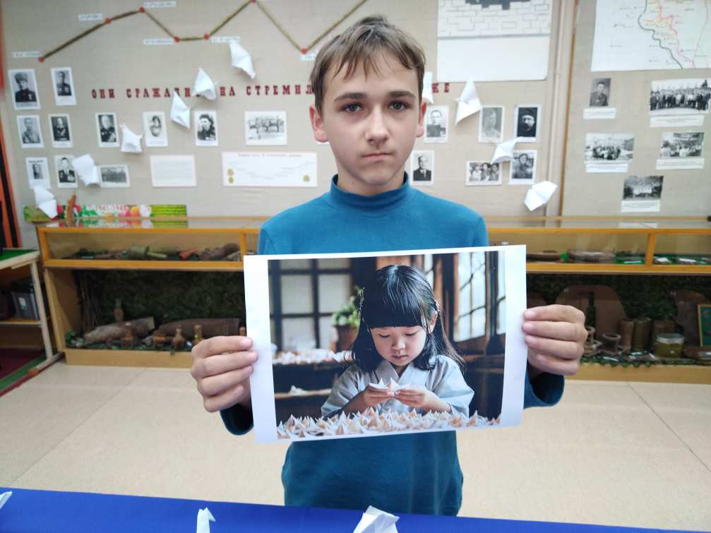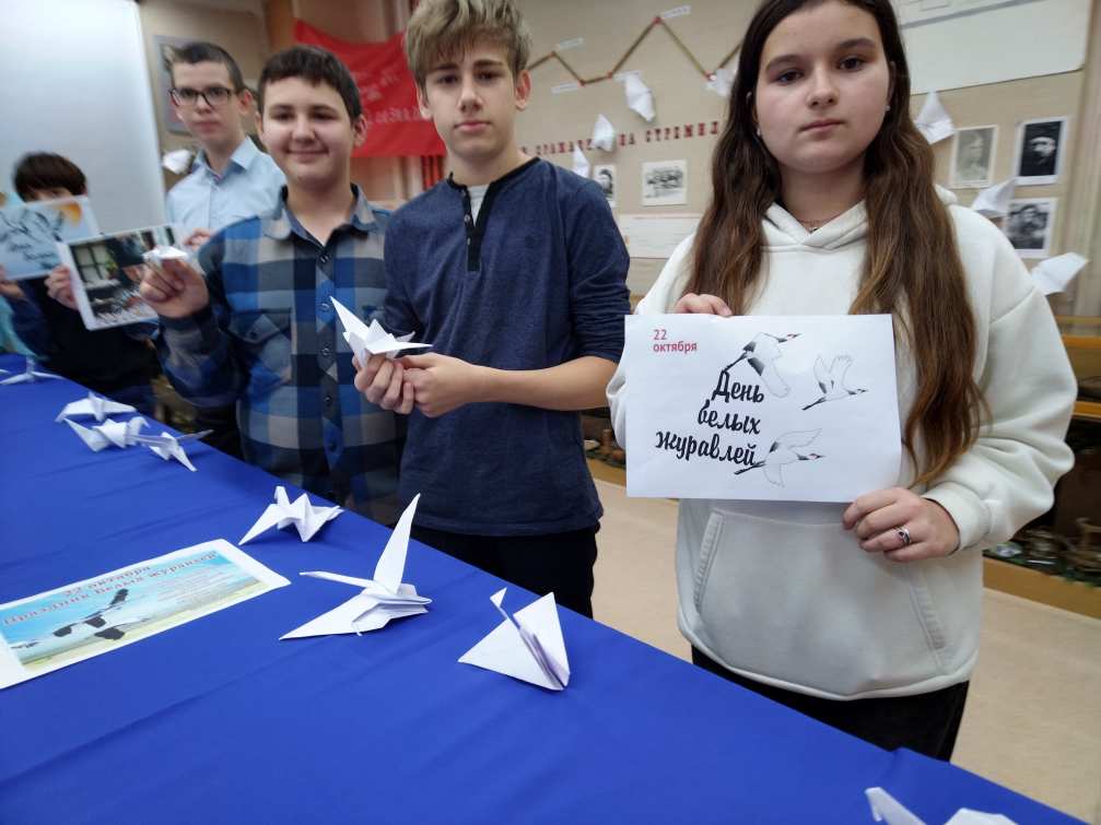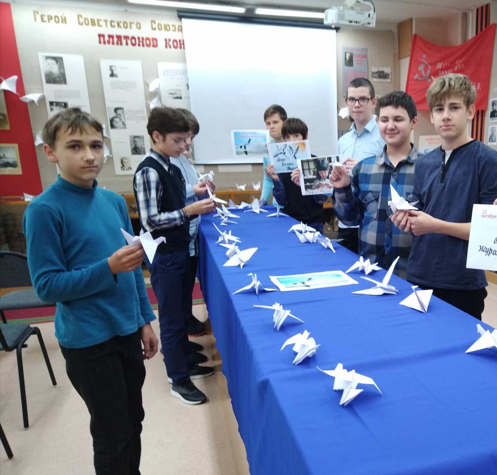 Наши школьники познакомились с историей возникновения этого дня, с историей японской девочки Садако Сасаки, которая делала бумажных журавликов в надежде побороть страшную болезнь. Дети, затаив дыхание, слушали песню «Журавли», музыку к которой сочинил Ян Френкель, а исполнил Марк Бернес. А сделанные детскими руками белые журавлики украсили портреты воинов, не вернувшихся с войны.