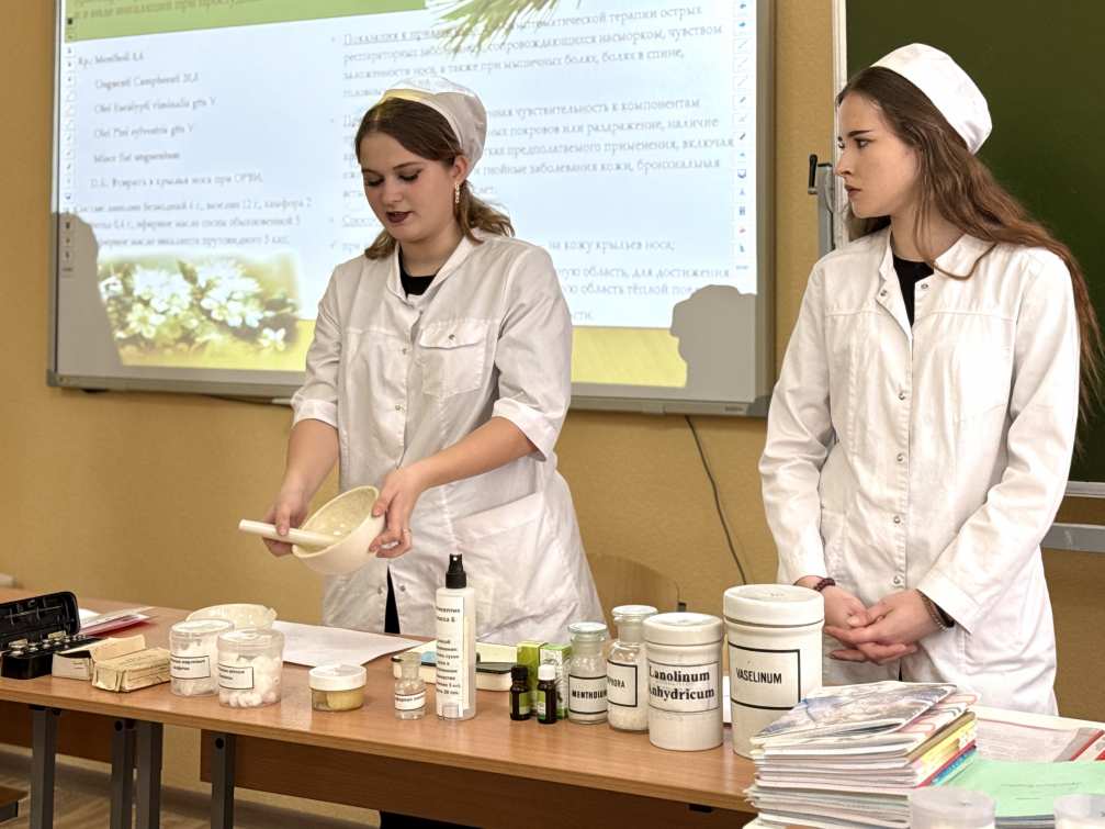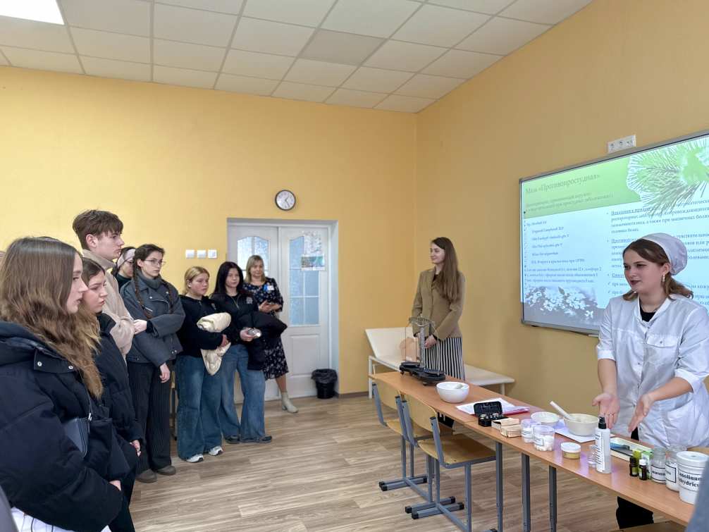Под руководством преподавателя Е.С. Таций: студенты Яна Хавик и Дарья Гасинец продемонстрировали процесс создания мази. Участники мастер-класса узнали о различных компонентах, входящих в состав противопростудных средств, доступных для приобретения в аптеках, а также о технологии их смешивания.