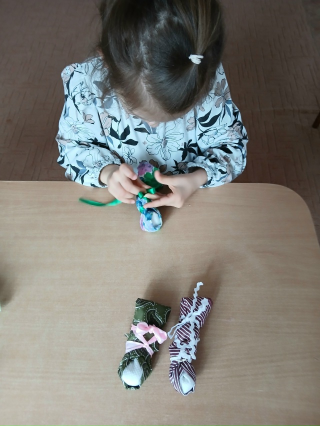 В процессе реализации проекта "Русские игрушки" я провела комплексное занятие по ознакомлению с куклой-пеленашкой. После показа процесса изготовления, предложила девочкам самостоятельно приготовить такую куколку для игры.