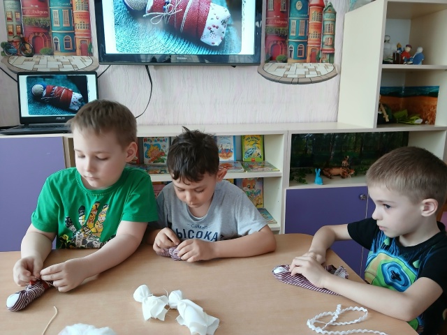 Мальчики, наблюдая, как девочки изготавливают куколок, решили тоже изготовить своих пеленашек. Не ожидала, что мальчишки заинтересуются такой работой.