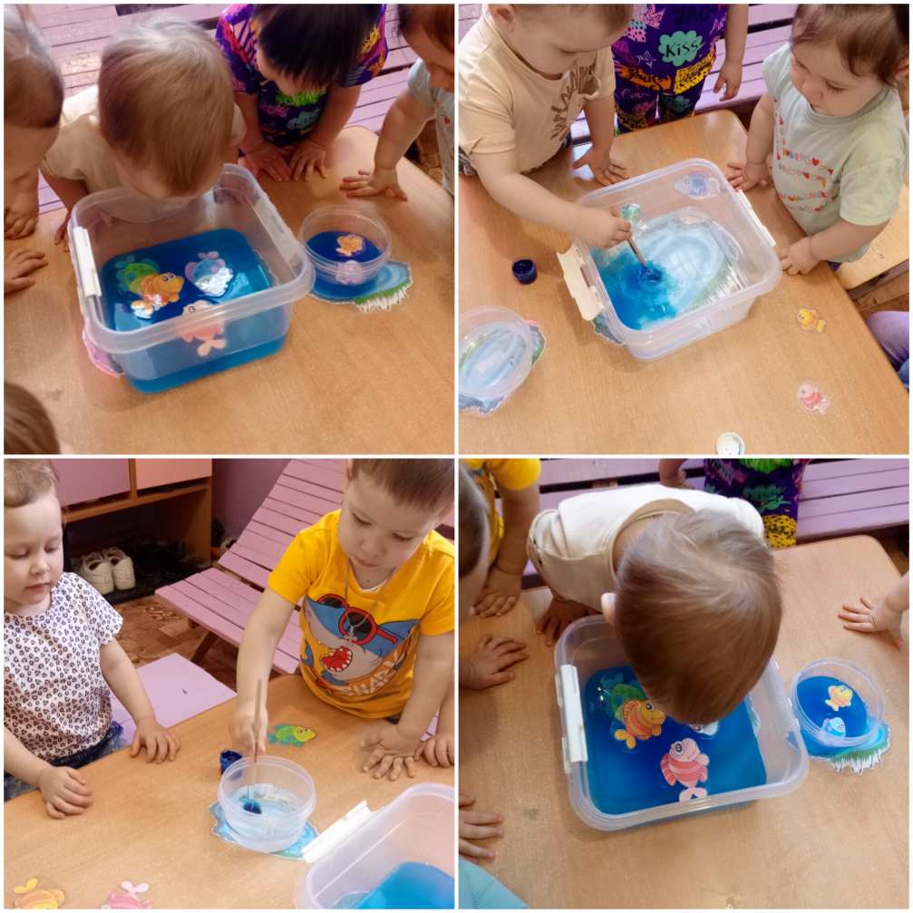 Началась неделя с занятия "Рыбки плавают в пруду". Малышам нужно было распределить маленьких и больших рыбок в пруды соответствующей величины. Но перед этим они провели исследовательскую работу, узнав, что с помощью краски можно окрасить воду.