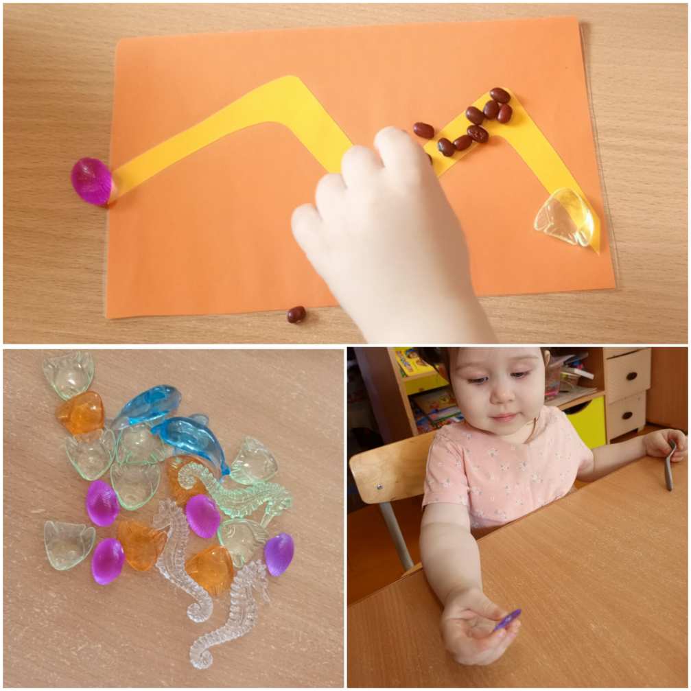 - Игра "Поймай ракушку". Рыбке нужно поймать ракушку, перед этим выложив дорожку из камушков (фасолинок).