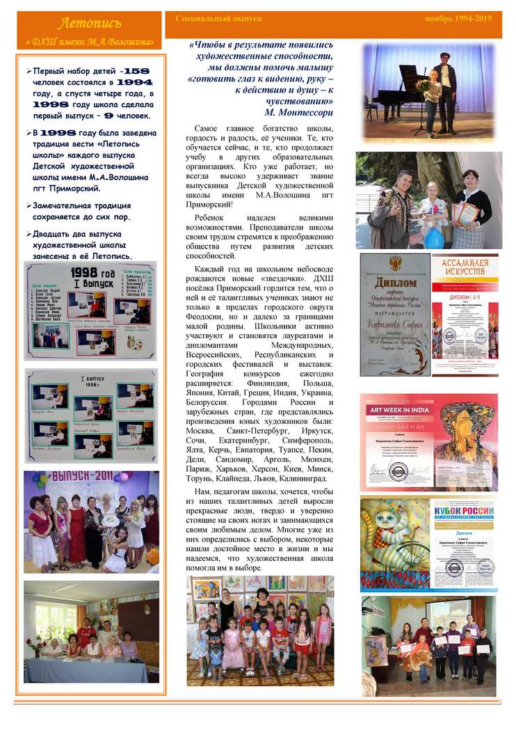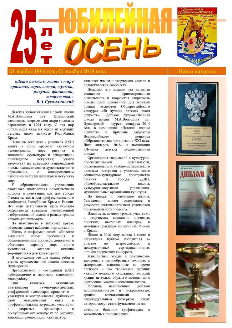 Детская художественная школа имени М.А. Волошина пгт Приморский распахнула впервые свои двери молодым дарованиям в 1994 году. С тех пор организация является одной из ведущих детских школ искусств Республики Крым.