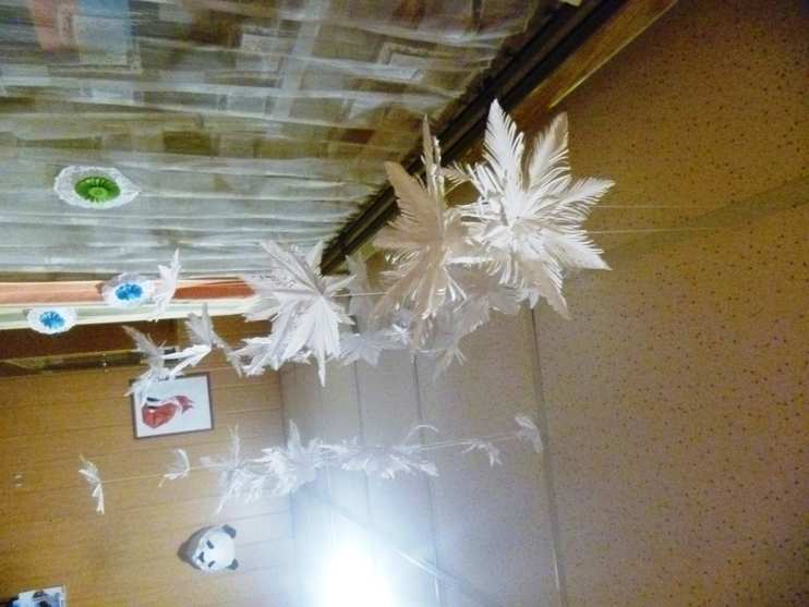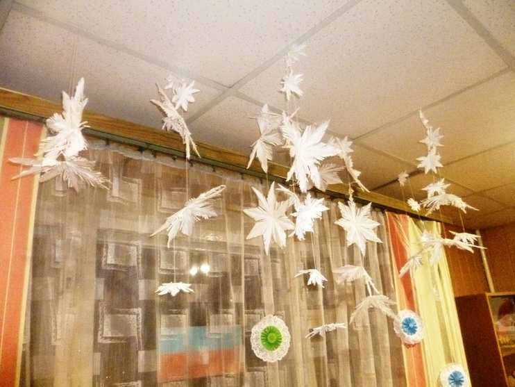 Оформление кабинета декоративно-прикладного творчества снежинками-пушинками. Подвешиваем на потолок и получается мобиль из снежинок. Снежинки-пушинки очень популярны и просто делаются. Дети любого возраста, которые свободно обладают навыками обращения с ножницами, могут создать такие снежинки.