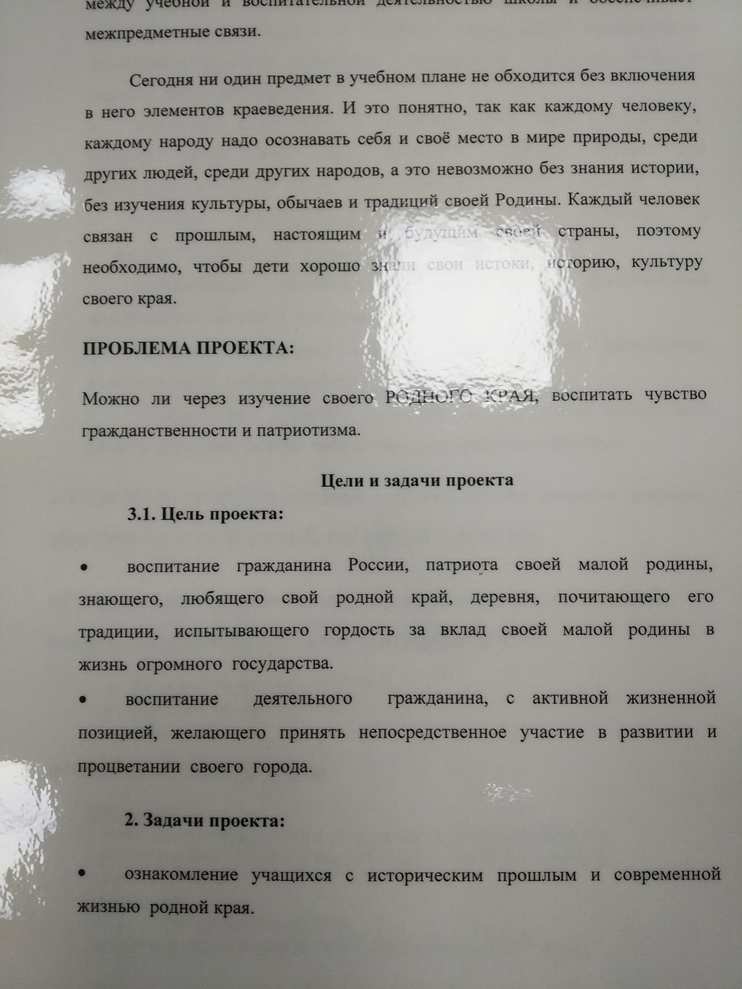 Одной из целью данного проекта является воспитание активного, сознательного гражданина страны, патриота своей Родины. Действительно, изучение истории, традиций родного края, формирование бережного отношения к достопримечательностям и воспитание чувства гордости за свою малую Родину - несет в себе огромный воспитательный потенциал подрастающего поколения. Молодцы! Так держать!