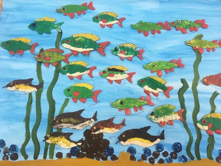 Материал: пластилин, стеки, вырезанные из картона силуэты рыбок, дощечки для лепки, салфетки на каждого ребенка.