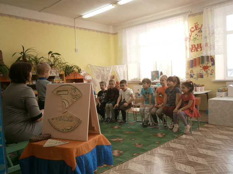 Воспитатель: А сейчас предлагаю немного отдохнуть (физминутка). (Пальчиковая гимнастика) «Будем денежки считать»: Один, два, три, четыре, пять (шагаем на месте). Будем денежки считать (сжимаем и разжимаем пальцы рук). Один и два оплатим дом (пальцы в кулак, отгибаем мизинец и безымянный), дом, в котором мы живём. Третья монетка – одежду купить (отгибаем средний палец). На четвёртую монетку купим есть и пить (отгибаем указательный палец). Ну а пятую пока (шевелим большим пальцем) спрячем на донышке кошелька! (спрятать большой палец в кулак, согнув все пальцы).