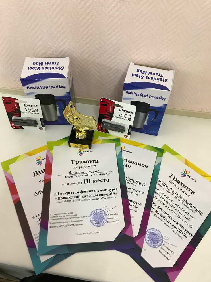 В декабре 2019 года мы с вокальным ансамблем «Триоль» приняли участие в I открытом фестивале-конкурсе «Новогодний калейдоскоп-2019». Конкурс прошел в Доме культуры «Ашитково» 15 декабря 2019 года. В нем приняли участие одаренные дети дошкольного и школьного возраста Воскресенского, Раменского, Коломенского районов. Конкурс прошел на очень высоком уровне.