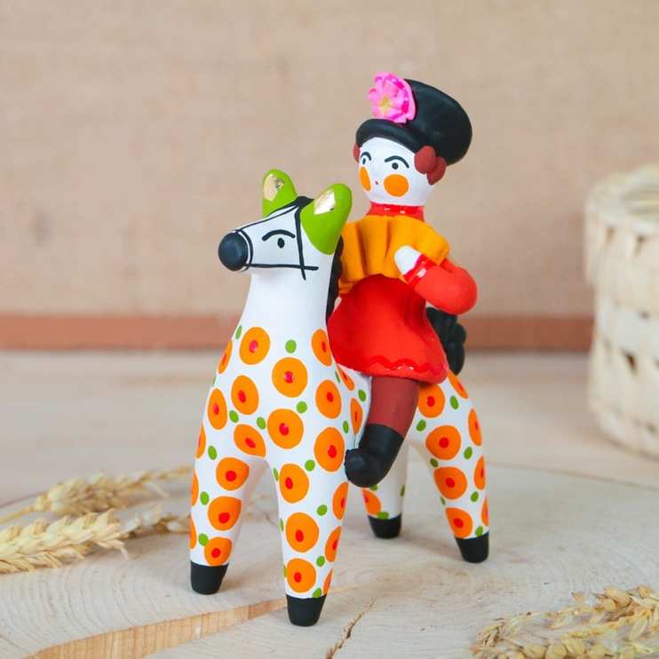 Краснощекие дымковские «Кормилки», «Водоноски», «Барыни» полны забавной важности и достоинства; а свистульки-бараны в штанишках, удалые всадники – веселы и задорны...