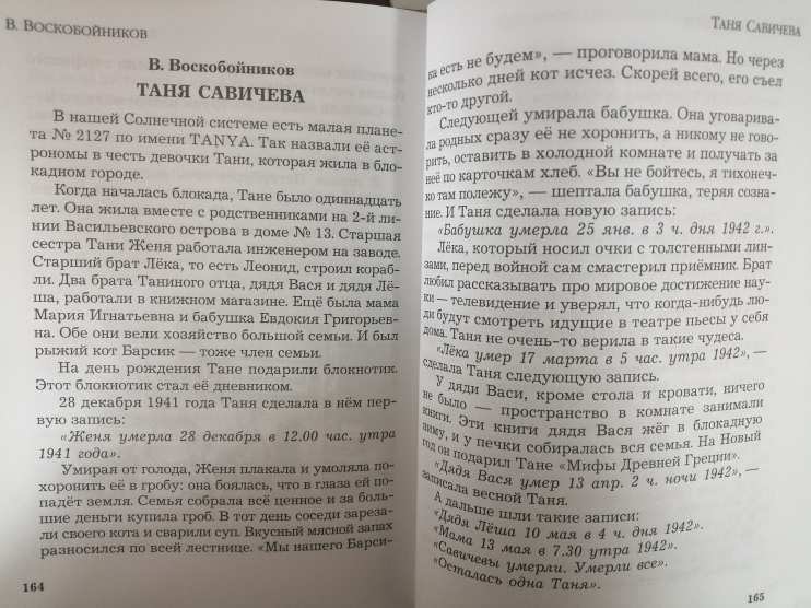 Особое впечатление на ребят произвела история одиннадцатилетней школьницы Тани Савичевой из книги В. Воскобойникова «Рассказы о юных героях», которая во время блокады вела дневник, куда записывала даты смерти своих родных.