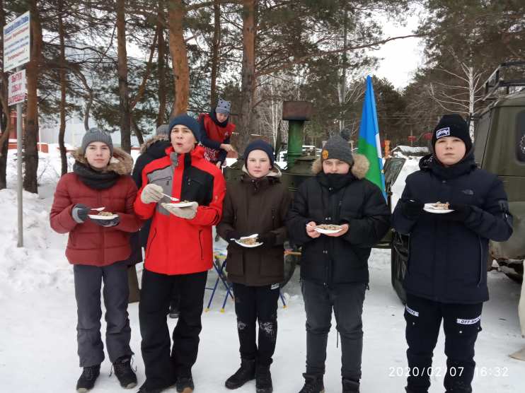 После игры ребята получили сладкий приз из рук Валерия Николаевича Аверинского, а затем угостились кашей полевой кухни. Несмотря на мороз, настроение у всех было отличное.