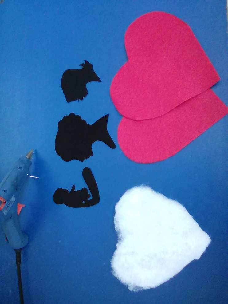 Для работы нам понадобится: два сердечка из фетра, ватин, контурное изображение мамы и ребёнка (вырезанное из бархатной бумаги), клеевой горячий пистолет.