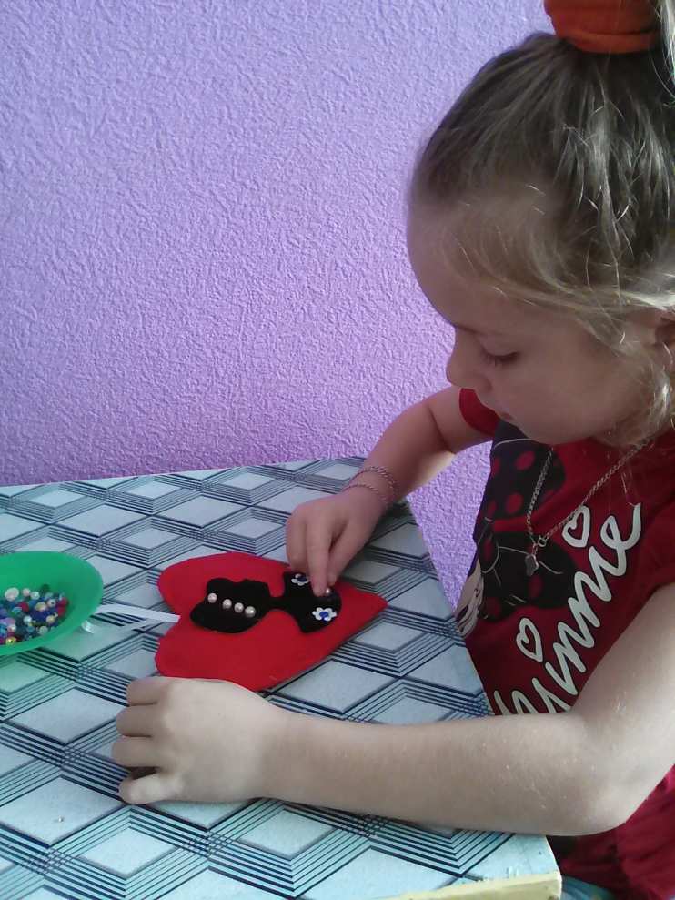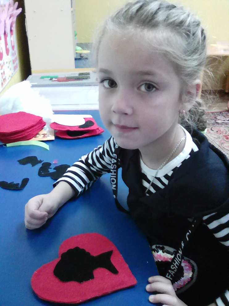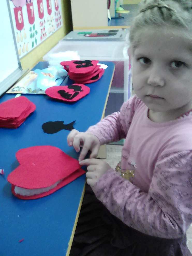Между двух сердечек из фетра кладём ватин для объёма, приклеиваем петельку из тесьмы и склеиваем сердечко горячим пистолетом. Вся работа проводилась индивидуально, так как работали с горячим пистолетом.