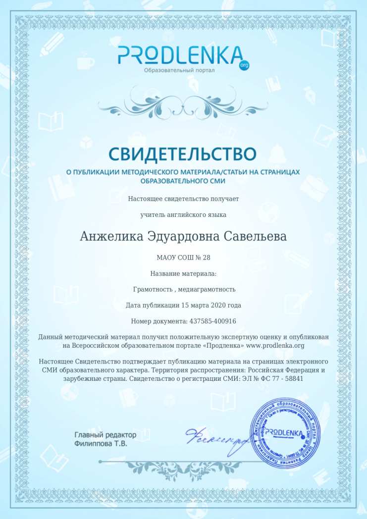 Выражаю признательность и благодарность создателям сайта "Продлёнка" за предоставленную возможность опубликовать материалы, поделиться наработками и выразить свои взгляды, суждения, предположения, педагогические исследования. Приятно получить одобрение, пропуск модерации материалов. Было волнительное ожидание и переживание о своих материалах как о "неком детище". У первых материалов полученные печатные грамоты вызвали восторг и трепет от красивой полиграфии и аккуратного ламината.