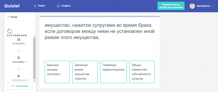 Давайте делиться опытом! Как вы проводите дистанционное обучение? Как это сделать эффективно и интересно? Зазубривание учебников? Только особо сознательный студент будет это делать. А вот портал Quizlet дает хорошую возможность для запоминания слов. Сама лично опробовала на примере заучивания новых английских слов! Если пройти все задания, то слова настолько в голову «вбиваются», что забыть их уже очень сложно. На портале Quizlet вы можете создавать свои собственные карточки со словами для запоминания, а потом делиться ими с другими. Вот и я создала такие карточки для своих студентов по теме «Семейное право» и «Трудовое право». Преимущество портала также заключается в том, что вы можете отслеживать результаты ваших студентов. Сами студенты могут не только «зубрить» слова, но и потом их повторять с помощью игр, которые также предоставляет портал Quizlet.