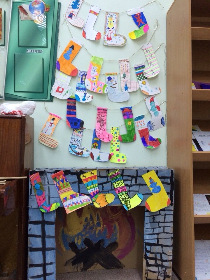 В третьем классе мы сделали камин из картона и гирлянды.