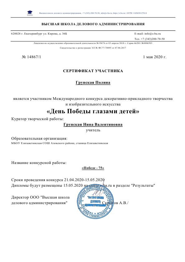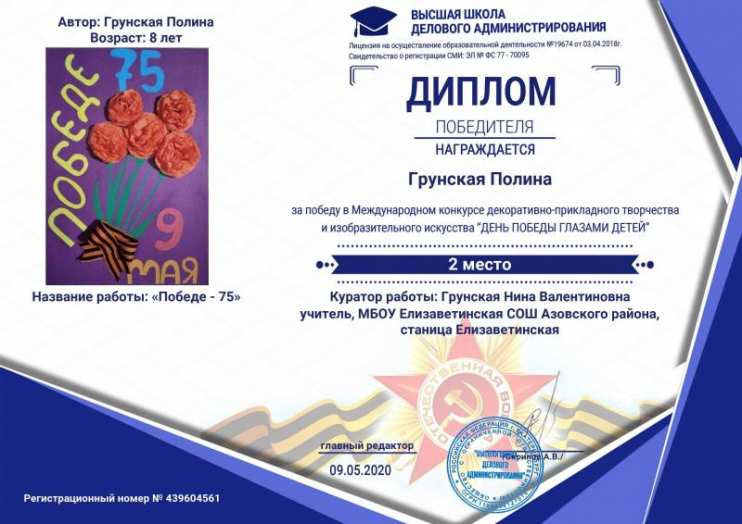 1 мая 2020 года, в условиях дистанционного обучения, Грунская Полина, ученица 2 класса, приняла участие в международном конкурсе декоративно-прикладного творчества и изобразительного искусства «День Победы глазами детей».