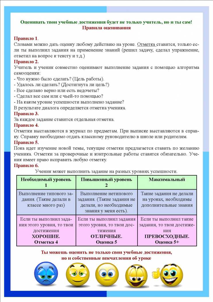 Выполнение правил позволяет заметно снизить показатели уровня тревожности, а также заметно возрастает сознательное отношение учеников к целям обучения и к самой учебной деятельности, развиваются качества контрольно-оценочной самостоятельности.