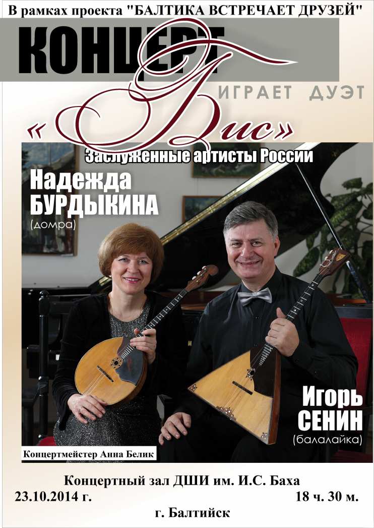 23 октября 2014 года в концертном зале Детской школы искусств имени И.С. Баха города Балтийска состоялся замечательный концерт дуэта «БИС» Заслуженных артистов России Надежды Бурдыкиной и Игоря Сенина в рамках проекта «Балтика встречает друзей».