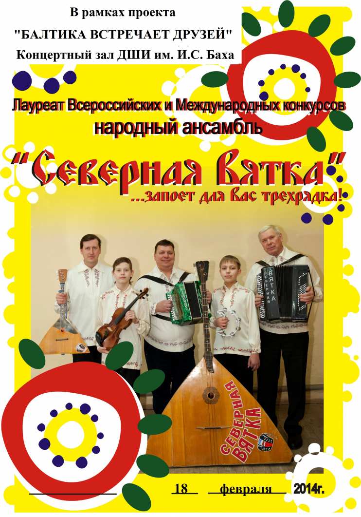 18 февраля 2014 года в детской школе искусств имени И.С. Баха города Балтийска состоялся концерт народного ансамбля «Северная Вятка» в рамках проекта «Балтика встречает друзей». Ансамблю в 2014 году исполнилось 15 лет. В его составе преподаватели и ученики детской школы искусств села Бобино Слободского района Кировской области: Вячеслав Демин (гармонь, баян, балалайка), Анатолий Мильчаков (баян), Александр Таширев (балалайка-бас), Илья Демин (вокал, ударные), Григорий Таширев (скрипка, ударные). В репертуаре ансамбля «Северная Вятка» народная музыка, песни советских и российских композиторов. Специально для слушателей самого западного города артистами ансамбля были выучены новые произведения о море и флоте. По окончании встречи с музыкантами ветеран Великой Отечественной войны Владимир Щукин высказал свое восторженное мнение: «С такими артистами и больница не нужна. Это — сила, энергия и вера!»