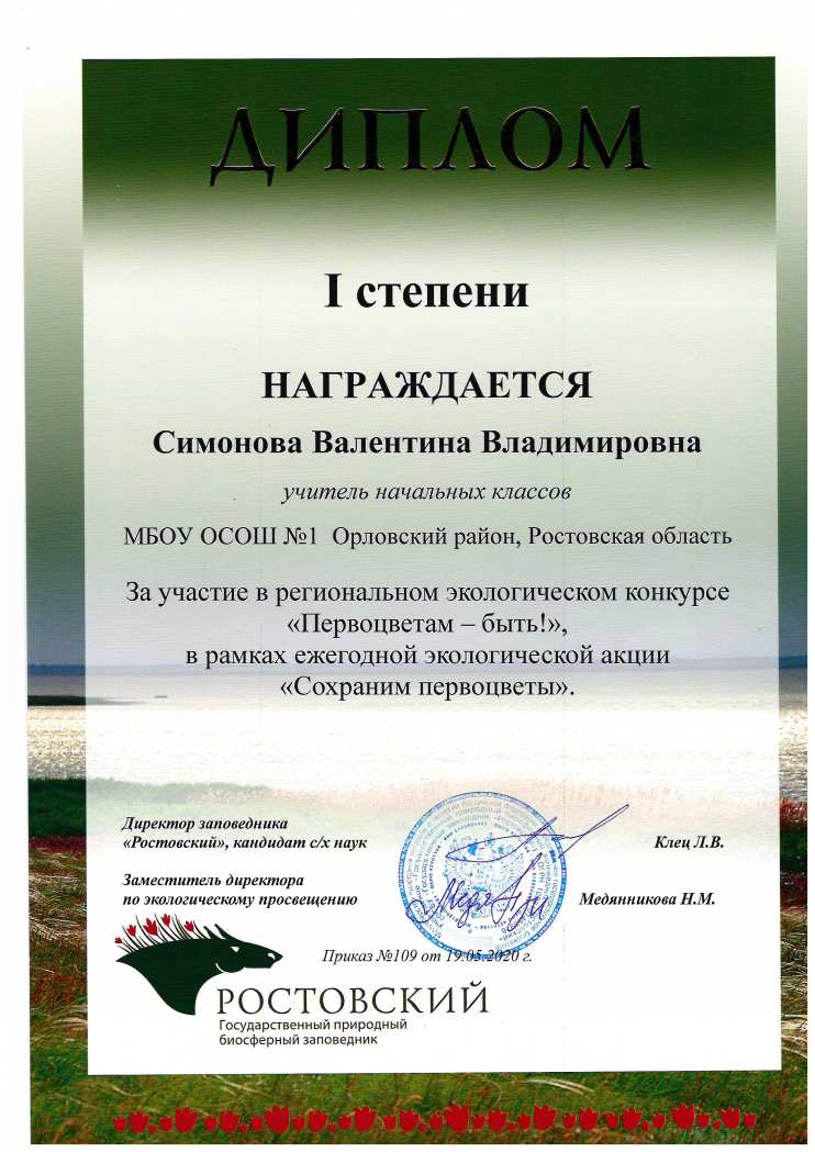 В марте-мае этого года мы с пятью ребятами участвовали в региональном конкурсе, организованном «Государственным природным биосферным заповедником Ростовский» – «Первоцветам быть!!» (работы в виде публикаций в социальных сетях (ВКонтакте, Одноклассники, Facebook), посвященные теме конкурса, включающие фото или видео (использование собственных материалов участников), интересные факты, призыв сохранить первоцветы: Дубниченко В., Замуреева В., Семенова Д., Приколота А., Ковшарь Л.).
