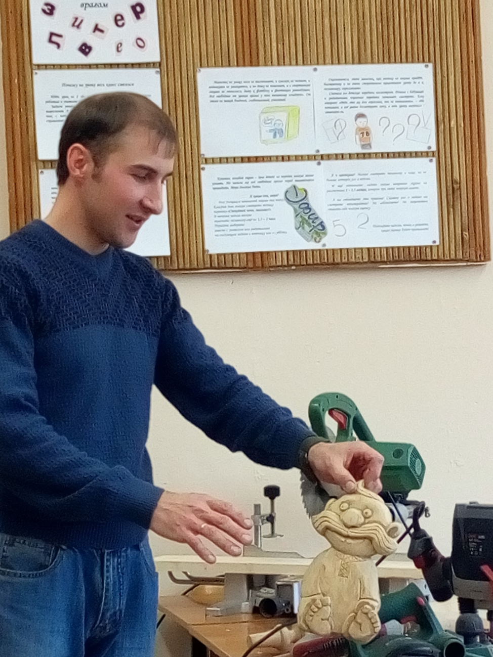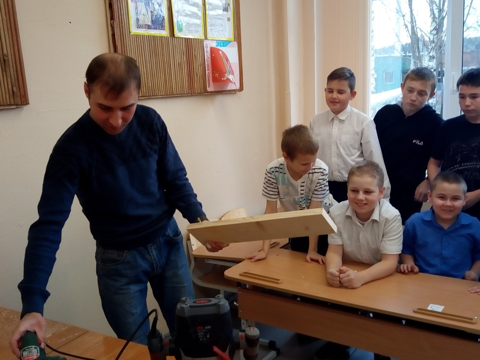 С волнением и интересом следили мальчишки за работой Калыпина Дмитрия Викторовича. Столяр-краснодеревщик - написано в его дипломе. Много незнакомых названий услышали ребята - "штангенциркуль", "угломер", "лучковая пила". Увидели, как работает столяр лобзиком, дрелью, долотом.