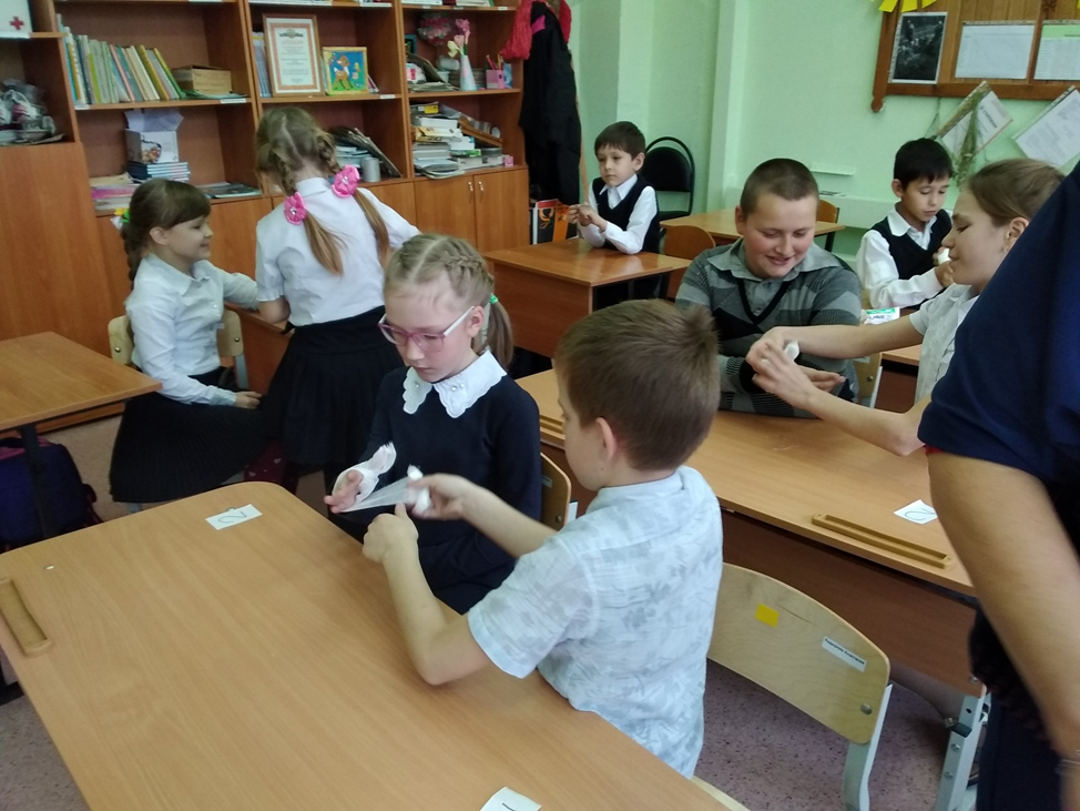 Частый гость в нашей школе - фельдшер Семакина Галина Леонидовна. Как оказать первую медицинскую помощь при порезах, ссадинах - идёт рассказ на мастер-классе "Профессия фельдшер".