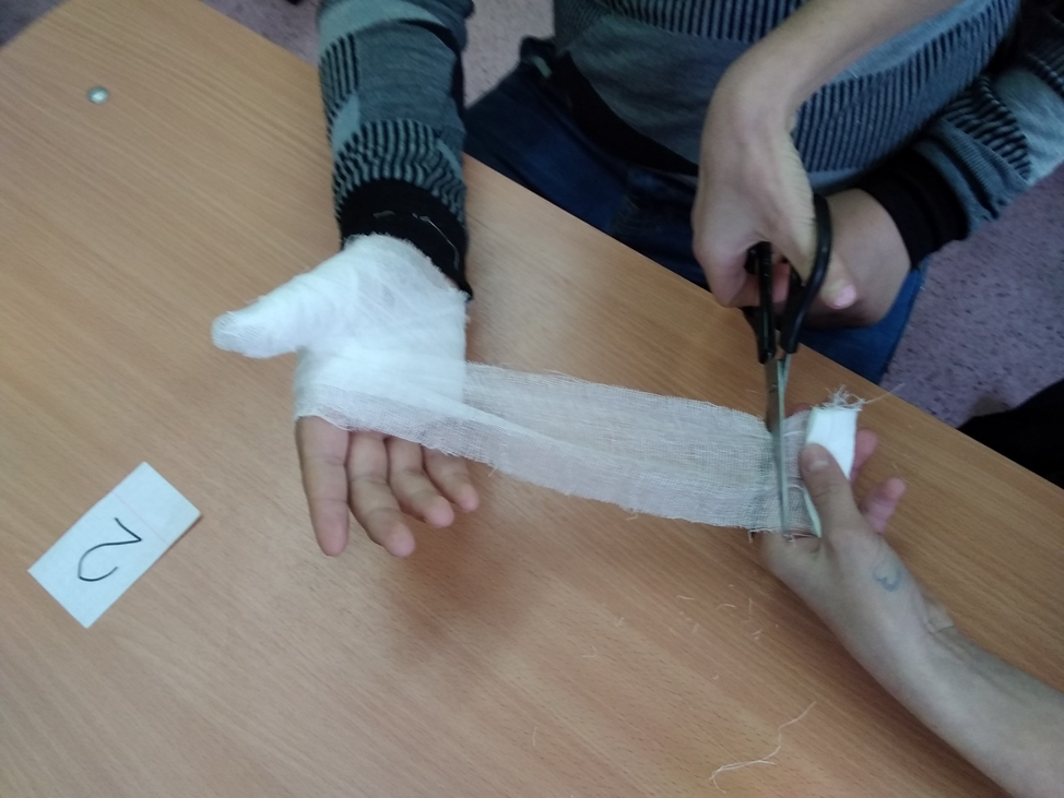 Ребята учатся накладывать повязку. "Чтобы стать врачом, нужно много учиться", "Доктор всегда должен уметь точно и быстро определить, что случилось с больным человеком", "Врачи работают днём и ночью и всегда готовы прийти на помощь" - такие выводы сделали ребята.