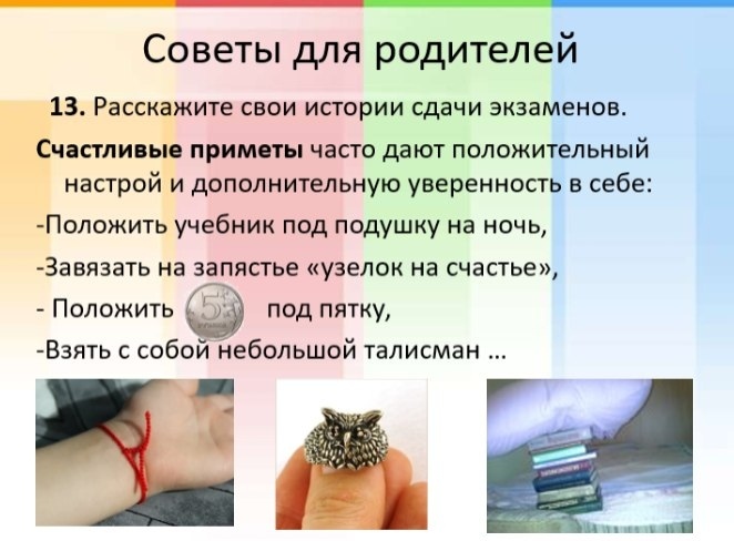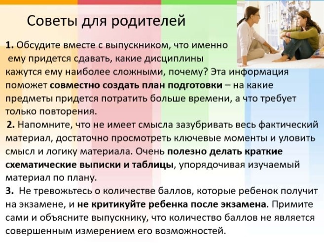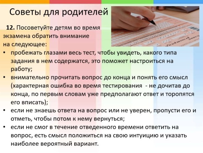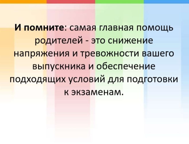 Очевидно, что в этой ситуации выпускник более, чем когда-либо нуждается в психологической помощи и поддержке родителей, педагогов, психологов. Данные рекомендации помогут родителям и педагогам грамотно и эффективно поддержать выпускников, а самим выпускникам найти способы самоорганизации и саморегуляции при подготовке к экзамену и во время его проведения.