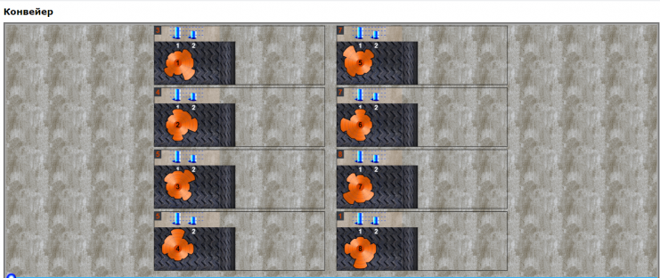 Требуется расставить штыри таким образом, чтобы после прохождения конвейера все 8 деталей были повернуты одинаково.
