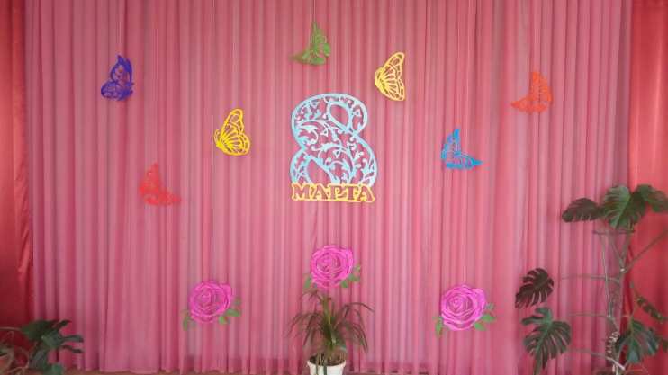 Вот такую необычную композицию с минимальным содержанием элементов оформления решила создать для заднего фона зала к празднику 8 марта. Использовала увеличенные шаблоны вытынанок, которые распечатывала на обычных листах А4 частями, затем вырезала, склеивала в единое целое, переводила на ватман, уже готовый рисунок на ватмане для жесткости дополнительно приклеивала к плотной бумаге, вырезала ажурные элементы канцелярским ножом, и потом выполнила в цвете гуашью. Величина восьмерки - это формат А1, ватмановский лист, бабочки и розы - формат А3. Подвешивали за капроновые нити. Итог представлен на фото). Думаю, может кому пригодится для идеи.